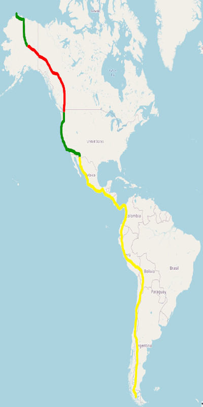 The route through the Americas has an ancient history. It is the path the first human settlers took after crossing over from Asia. This migration went south and across two continents in a very brief time. All of this without the aid of a bicycle. This route will follow some of that path out of Alaska and down the Pacific coast. It will go through the jungles of central America and over the Andes mountains.